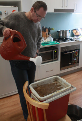 Here's Him Outdoors brewing beer. It is a good thing, and although he takes over the kitchen and uses every piece of kitchen equipment in the house (and garden - look at that watering can), it keeps him happy. I also assist in the enjoyment of the end product.