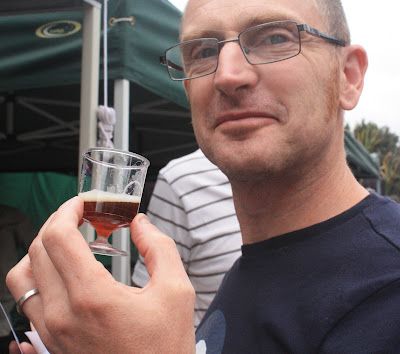 | Him Outdoors sniffed out the beer stall - of course - and is sampling some Goodieson ales |